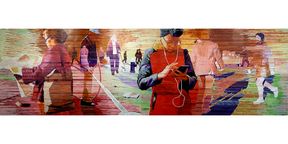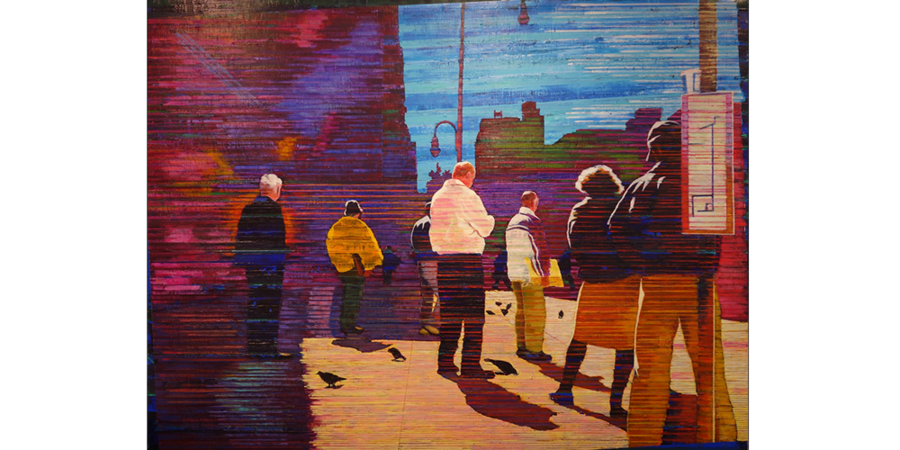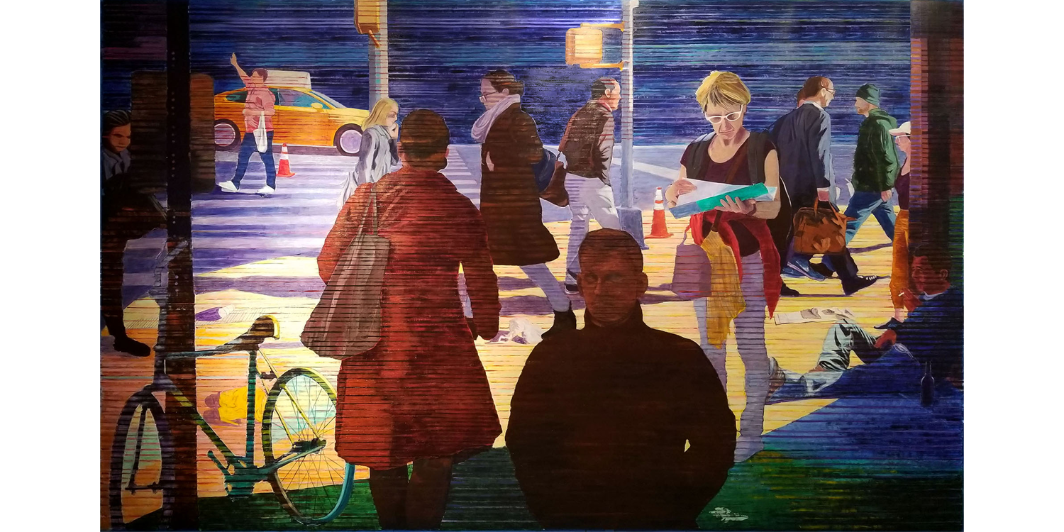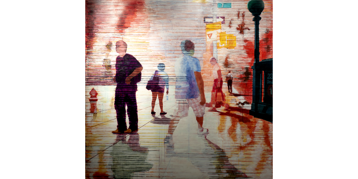 Corner Meeting (14th st.) acrylic on wood panel, 48 x 72 in. , 2015